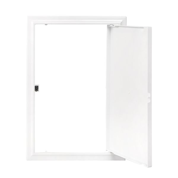 Открытие дверцы производится нажатием на замок. Дверца фиксируется в закрытом состоянии при помощи нажимного замка. Габаритный размер, указанный в наименовании - это габарит внутренней части люка, монтируемой в нишу.