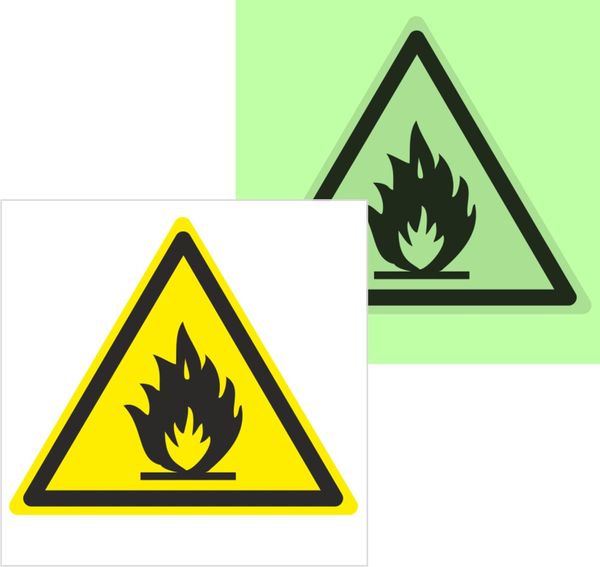 Знак наклейка W01 "Пожароопасно. Легковоспламеняющиеся вещества" (150х150х200) фотолюминесцентный ГОСТ 12.4.026-2015 EKF PROxima
