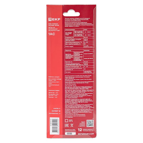 Детектор напряжения бесконтактный 1AC EKF Expert предназначен для бесконтактного определения переменного напряжения в электросети, а также определения фазного и нулевого проводов.