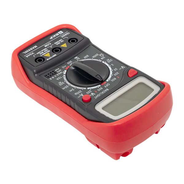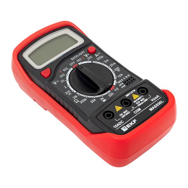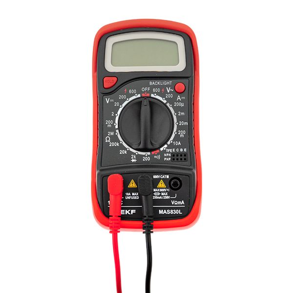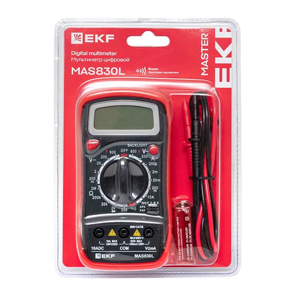 Мультиметр — это универсальный измерительный прибор. В функционал цифрового мультиметра MAS830B EKF Master входит измерение переменного напряжения до 600В, измерение постоянного напряжения до 600В, измерение постоянного тока 10А, измерение электрического сопротивления до 2МОм, проверка диодов и транзисторов, проверка целостности цепи (звуковая прозвонка), подсветка дисплея и функция DATA HOLD.