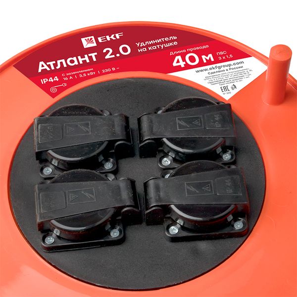 Удлинитель на катушке "Атлант 2.0" 4 гнезда 40м с заземлением ПВС 3*1,5 16А/3,5кВт IP44 PROxima EKF