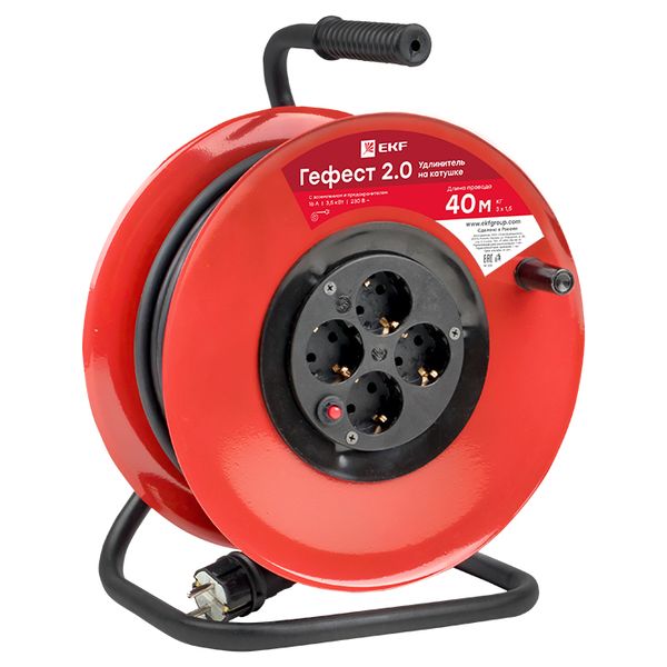 Удлинитель на катушке "Гефест 2.0" 4 гнезда 40м с заземлением и предохранителем КГ 3*1,5 16А/3,5кВт PROxima