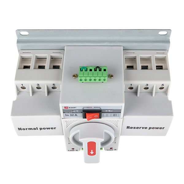 Устройство АВР EKF предназначено для обеспечения резервным электроснабжением нагрузки, подключенной к системе электрообеспечения, имеющей основной и резервный вводы. Устройство АВР автоматически подключает резервную линию питания в случае исчезновения напряжения на основной линии. Предназначен для трехфазных четырехпроводных (или однофазных однопроводных) систем двойного энергопитания переменного тока с частотой 50/60 Гц, номинальным напряжением 400 В/230 В и номинальным током до 63А. Устройство выполнено в виде моноблока и состоит из блока управления и двух модульных автоматических выключателей. На блоке управления имеется рычаг ручного переключения. Такая конструкция позволяет уменьшить габариты и площадь установки АВР.