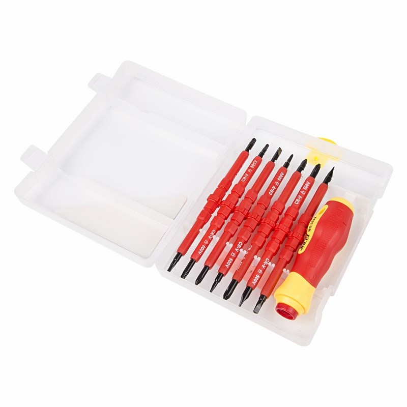 Стержень отвертки из высококачественной хромованадиевой стали с оксидированным намагниченным наконечником покрыт специальным изоляционным материалом.