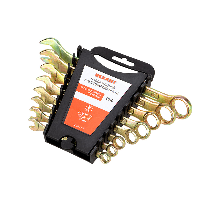 Набор ключей комбинированных REXANT (8-11, 13, 14, 17, 19 мм), 8 шт., желтый цинк |