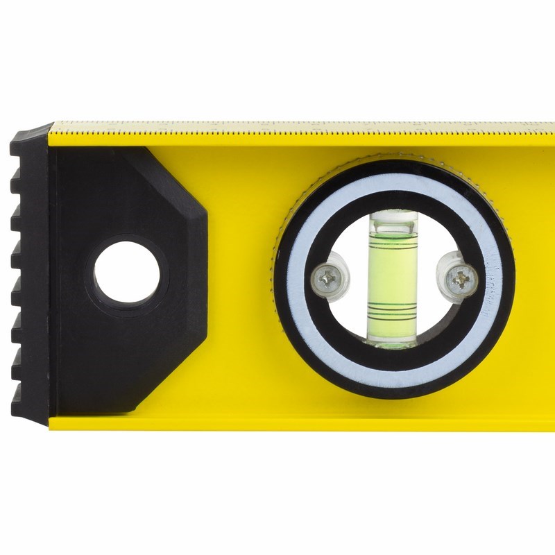 На одной из сторон уровня нанесена разметка для использования инструмента в качестве линейки. Пластиковые заглушки на торцах уровня защищают конструкцию при случайных падениях.