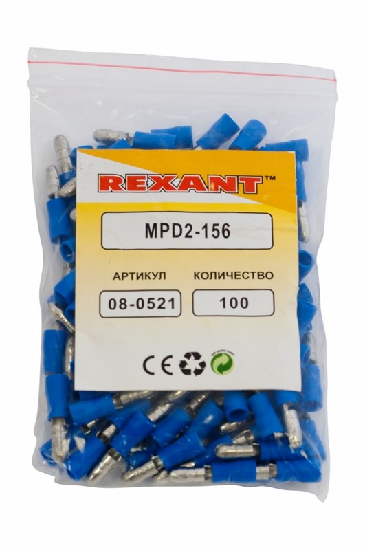 Изолированная штекерная клемма REXANT состоит из двух компонентов: металлического коннектора (штекер) и защитного изолятора, закрывающего место обжима провода. Металлический коннектор изготовлен из латуни, с поверхностным электролитическим лужением, а изолятор клеммы из поливинилхлорида (ПВХ), надежно защищающий место обжима кабеля от физических воздействий, а человека от поражения электрическим током. Обжатие производится специальными пресс-клещами (ht-301 H, ht-301 N, ht-301 W) поверх защитного изолятора. Цвет изолятора синий.