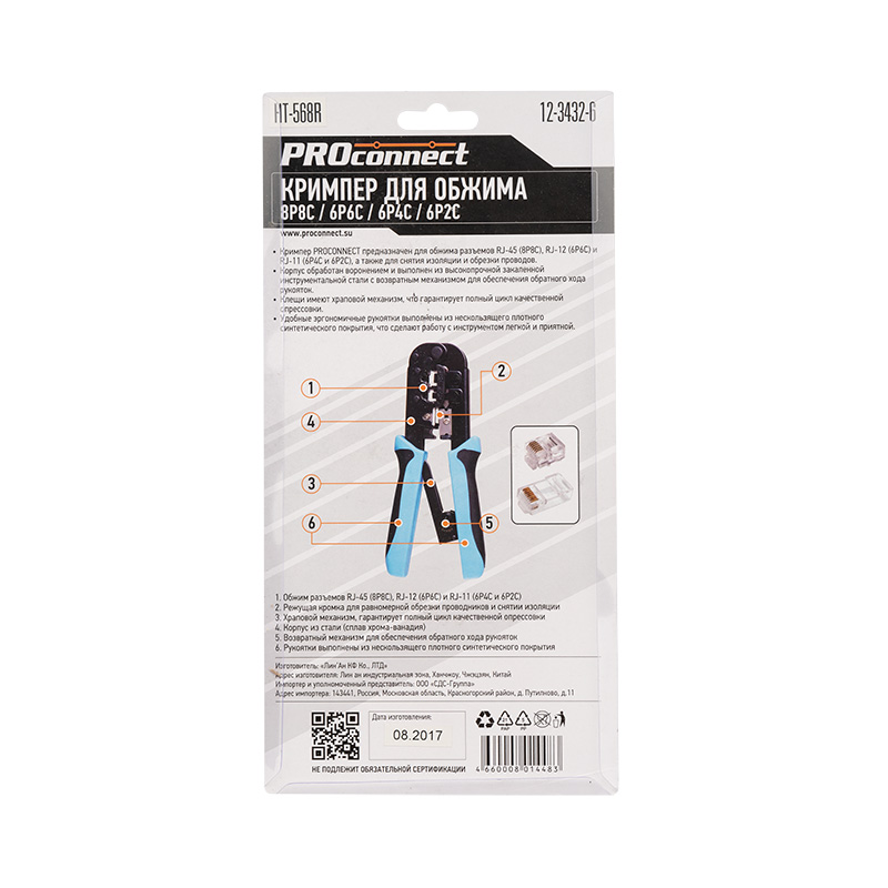Кримпер REXANT HT-568R — универсальный инструмент для обжима разъемов RJ-45 (8P8C), RJ-12 (6P6C) и RJ-11 (6P4C и 6P2C), а также для снятия изоляции и обрезки проводов.