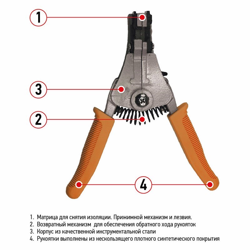 - Возвратная пружина для обеспечения обратного хода рукояток и регулятором размера зачистки кабеля.