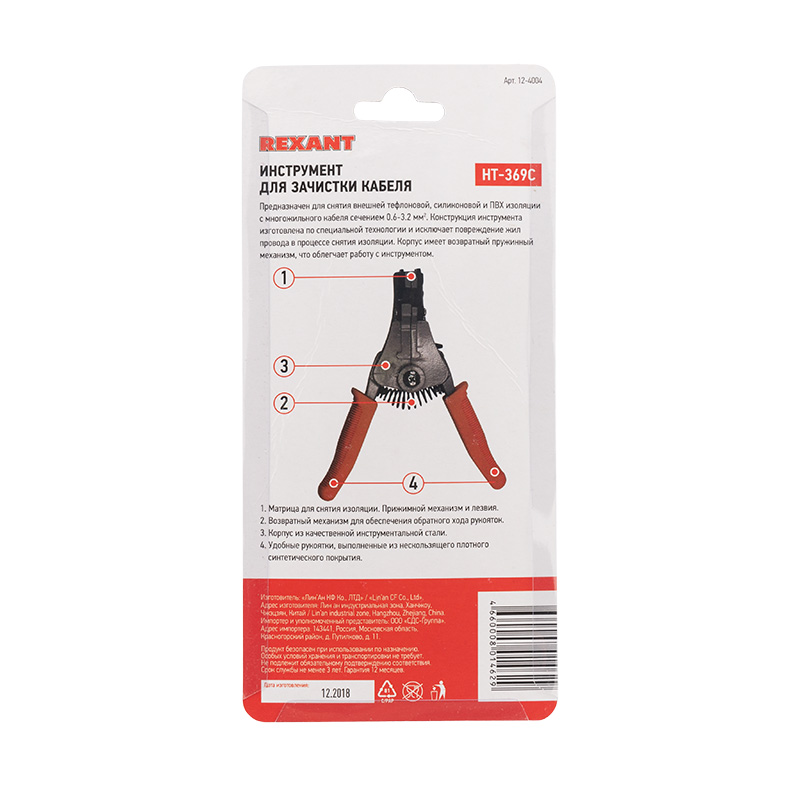 Инструмент REXANT HT-369 C предназначен для снятия внешней тефлоновой, силиконовой и ПВХ изоляции моножильного и многожильного кабеля с диаметром в диапазоне 0.6-3.2 мм. и сечением 0,3 - 6 мм².