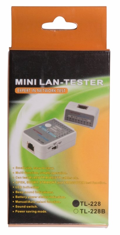 Тестер состоит из двух функциональных блоков — передатчика и приемника, которые подключаются к концам кабельной линии через разъемы RJ-45. Светодиодная индикация есть на основном блоке прибора и на удаленном модуле. Напряжение питания от батареи 12 В 23 A. Имеет индикацию зарядки батареи питания.