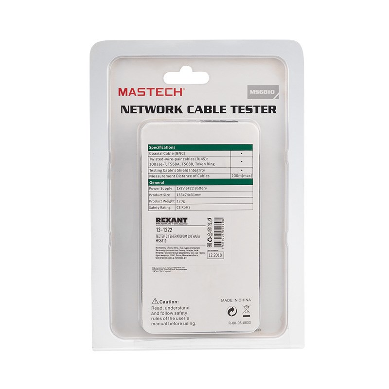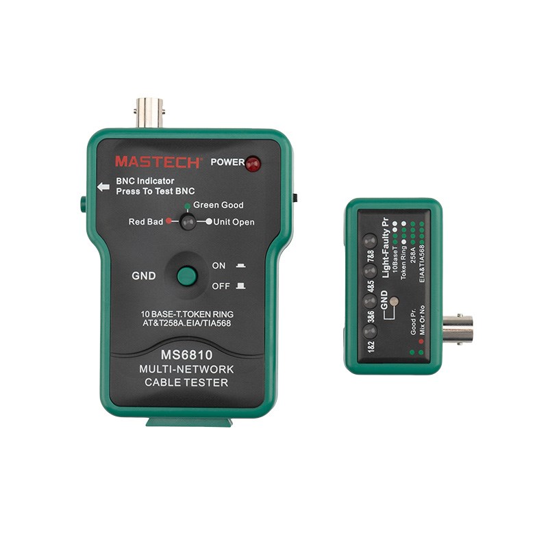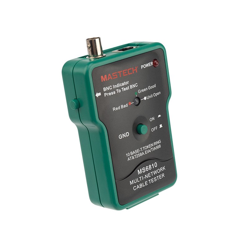 MASTECH MS6810 — многофункциональный сетевой тестер кабеля может использоваться для проверки коаксиальных кабелей (BNC), неэкранированных кабелей типа «витая пара» (UTP), экранированных кабелей типа «витая пара» (STP). Автоматически проверяет наличие обрывов, коротких замыканий, перестановки и реверса пар.
