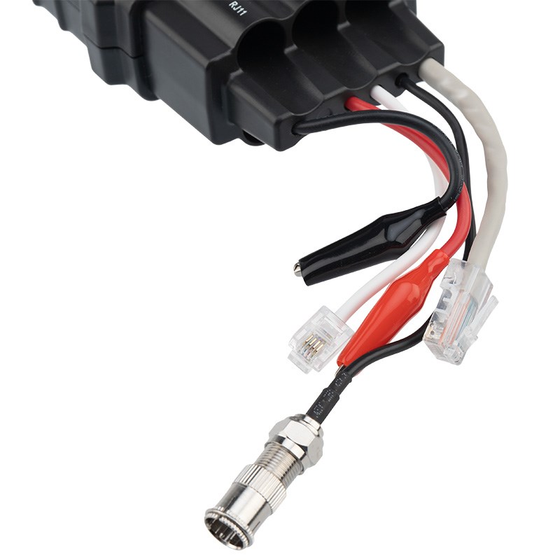 У передатчика есть 2 зажима «крокодилы» для подключения к проводу, разъемы коаксиального кабеля, LAN кабеля, а также телефонный разъем для проверки телефонной линии. Если провод, который вы собираетесь проверить, находится под напряжением, то к нему нельзя подключать передатчик. В комплекте к прибору прилагается сумка для большего удобства транспортировки и переноски. Прибор изготовлен из высококачественных материалов и имеет эргономичный дизайн.