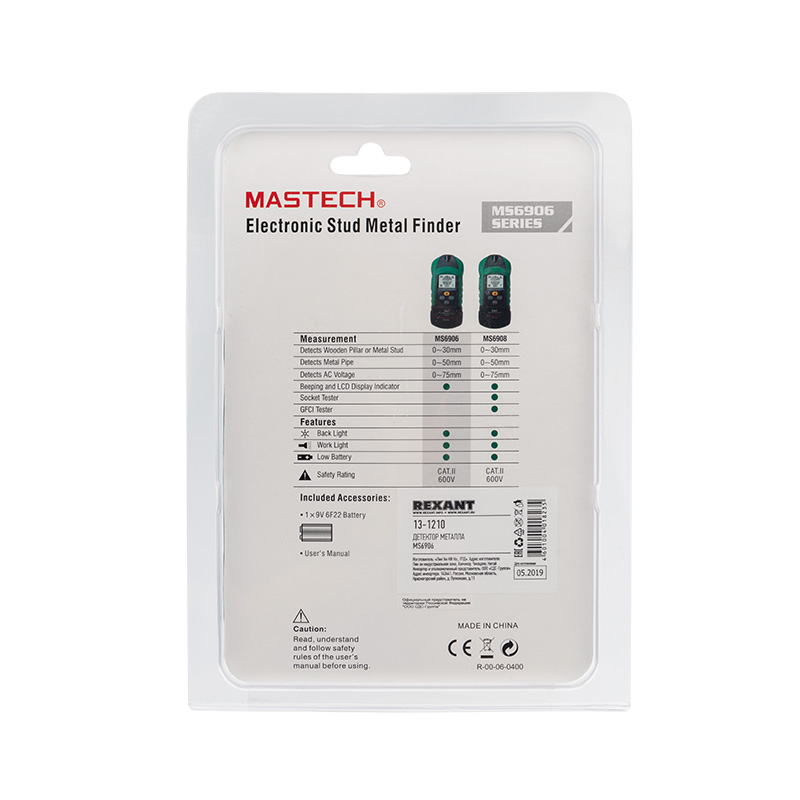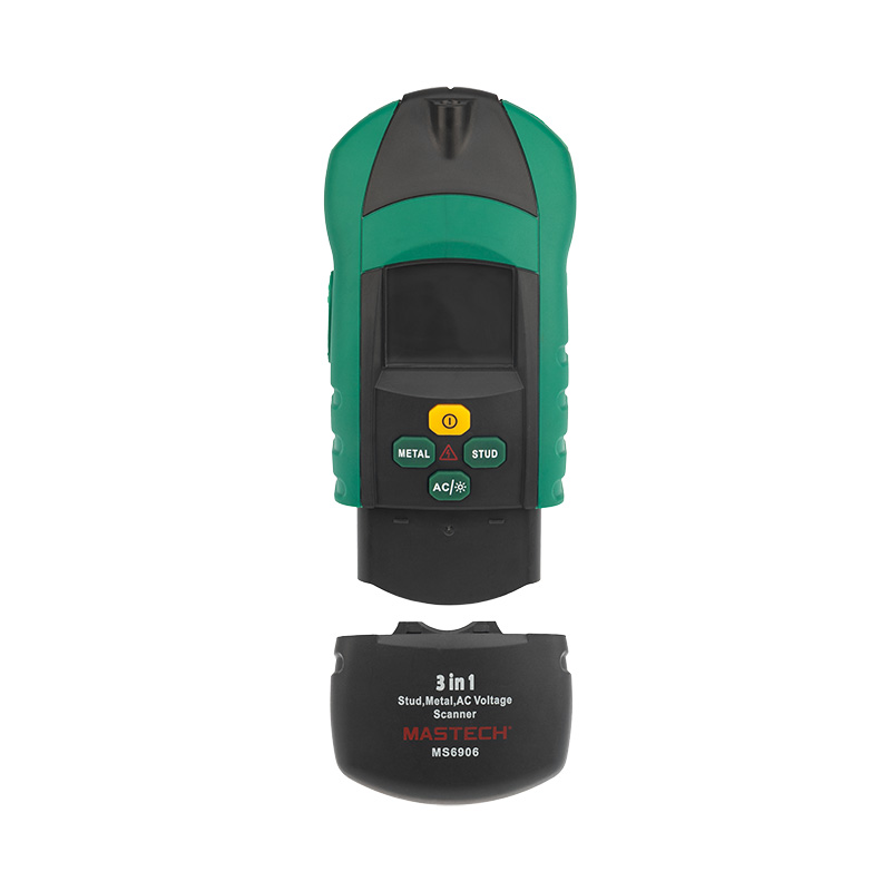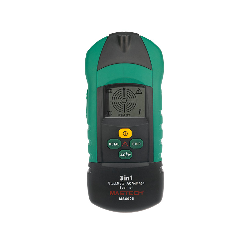 MASTECH MS 6906 — это многофункциональный прибор, включающий в себя большой набор возможностей. Предназначен для поиска металла, переменного напряжения, а также скрытых конструкций. С его помощью вы сможете обнаружить винты, гвозди, саморезы, шпильки, иголки и другие металлические предметы на глубине до 30 мм, металлические трубы на глубине до 60 мм и напряжение на глубине до 75 мм. Результаты поиска отражаются на дисплее прибора и обозначаются с помощью звукового сигнала.