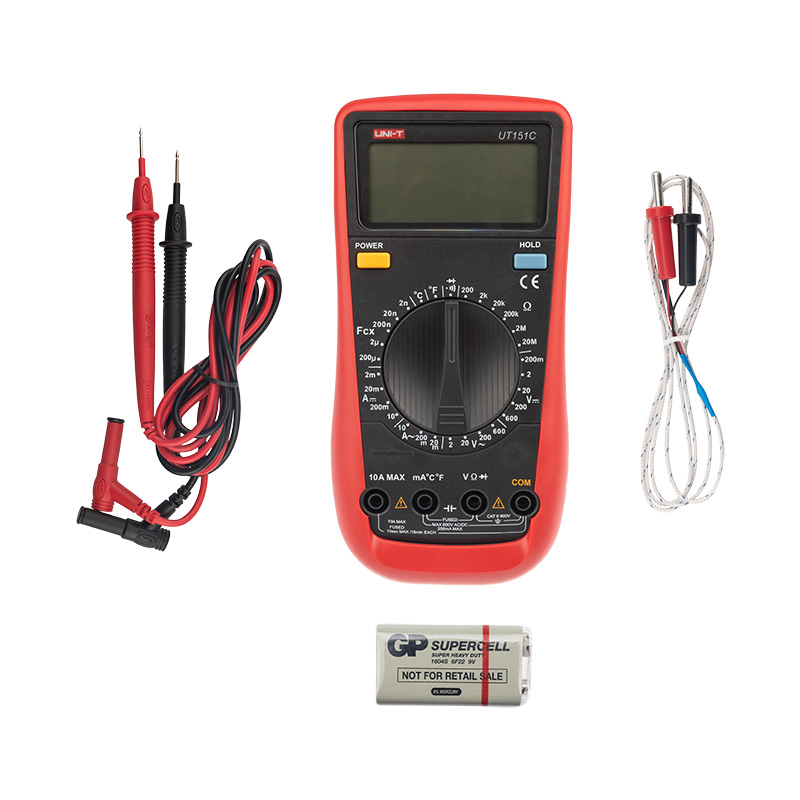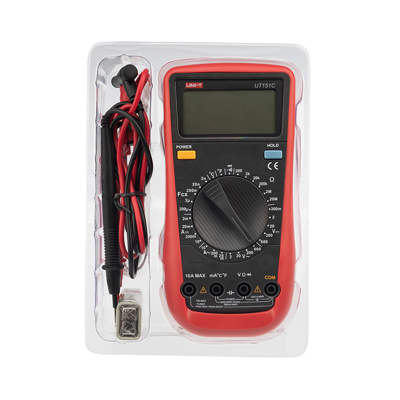Мульти́метр — электроизмерительный прибор, который включает в себя несколько функций и набор измеряемых параметров. Все приборы серии UT-151 измеряют напряжение, сопротивление и ток в цепи. Прибор UT-151C является универсальным мультиметром с удобным и легкочитаемым дисплеем и обладает широким функционалом. С его помощью вы сможете измерить постоянное и переменное напряжение, ток, сопротивление, электрическую емкость, температуру и даже частоту. А также с помощью данного прибора можно проводить тестирование диодов, батареек и осуществлять прозвонку целостности цепи.