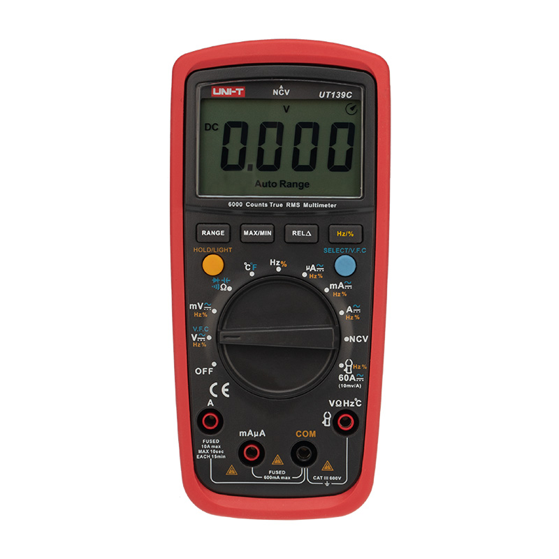 Универсальный мультиметр UNI-T UT139C с современным дизайном, большим дисплеем, подходит для измерения напряжения, силы тока, сопротивления, емкости, частоты и температуры. Обладает высоким классом точности. Имеет режим измерения среднеквадратичных значений TRUE RMS, бесконтактный детектер напряжения NCV.