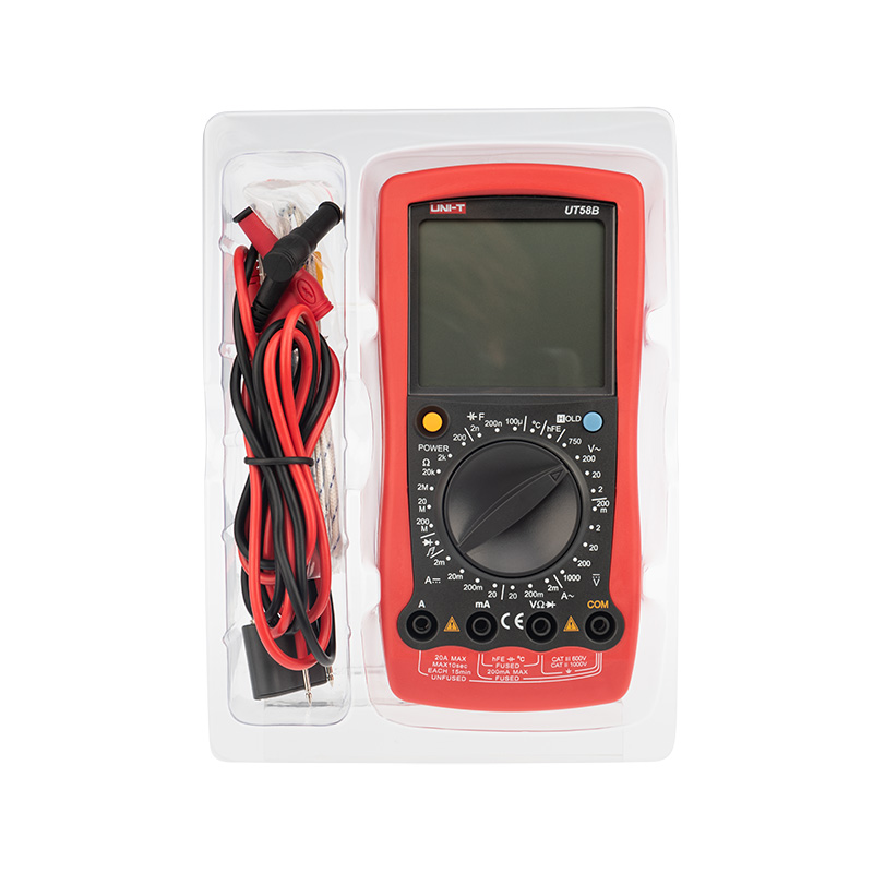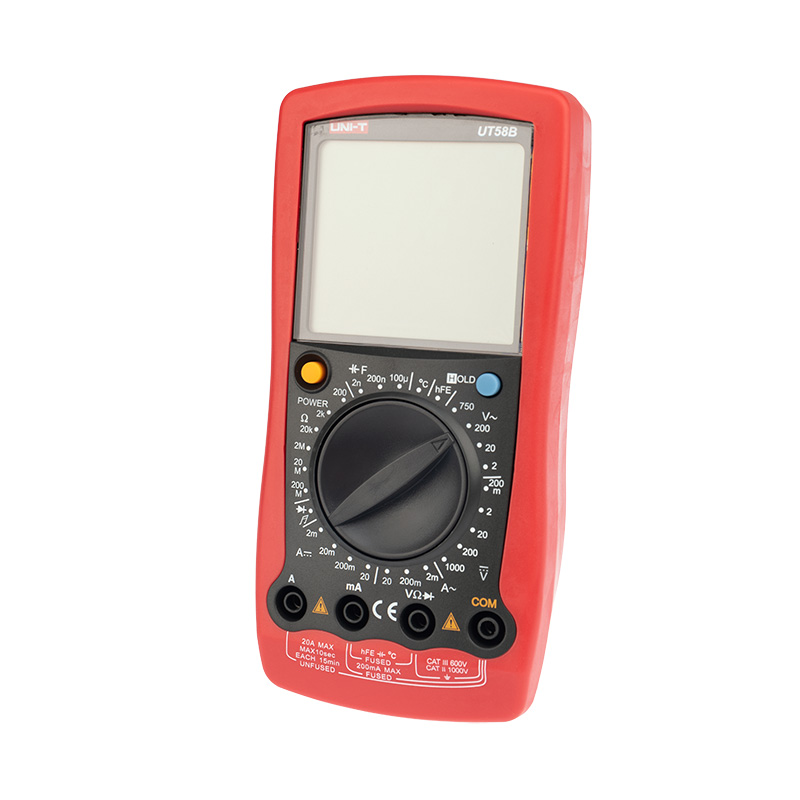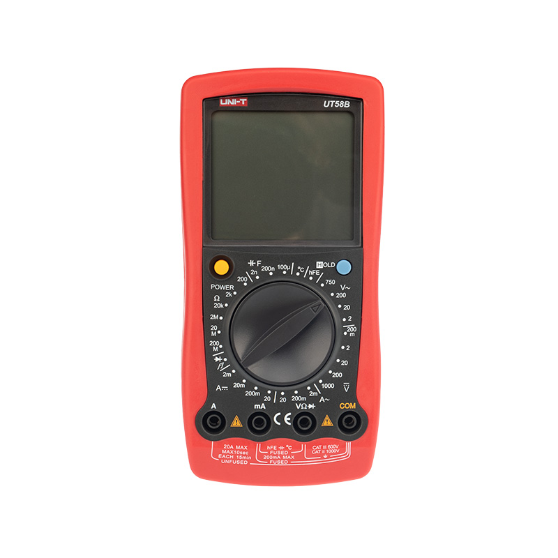 UT58B — это профессиональный мультиметр с современным и эргономичным дизайном. Предназначен прибор для измерений постоянного и переменного напряжения, сопротивления, постоянного и переменного тока. Кроме того, он имеет функции измерения электрической емкости и температуры, а также с его помощью вы сможете тестировать диоды и проводить прозвонку целостности цепи. Данный прибор обладает высоким классом точности показаний.