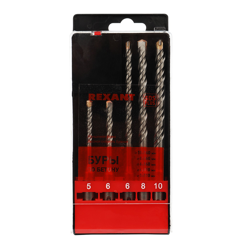 Набор буров по бетону 5-6х110, 6-8-10х160, 5 шт., в пластиковой коробке SDS PLUS REXANT.