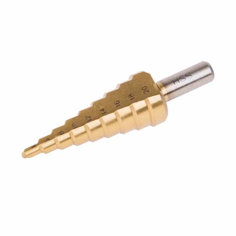Ступенчатое сверло предназначено для получения отверстий различного диаметра без перестановки режущего инструмента. Применяется в работе с такими материалами, как пластик, дерево, металл и др. Хвостовик прибора имеет форму конуса. На каждой ступени есть маркировка фактического диаметра. Сверло изготовлено из быстрорежущей инструментальной стали.