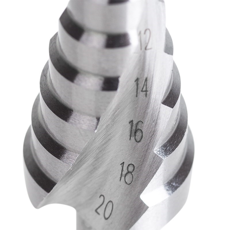 Ступенчатое сверло предназначено для получения отверстий различного диаметра без перестановки режущего инструмента. Применяется в работе с такими материалами, как пластик, дерево, металл и др. Хвостовик прибора имеет форму конуса. На каждой ступени есть маркировка фактического диаметра. Сверло изготовлено из инструментальной легированной стали и покрыто нитридом титана.