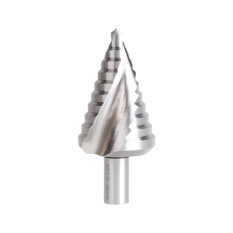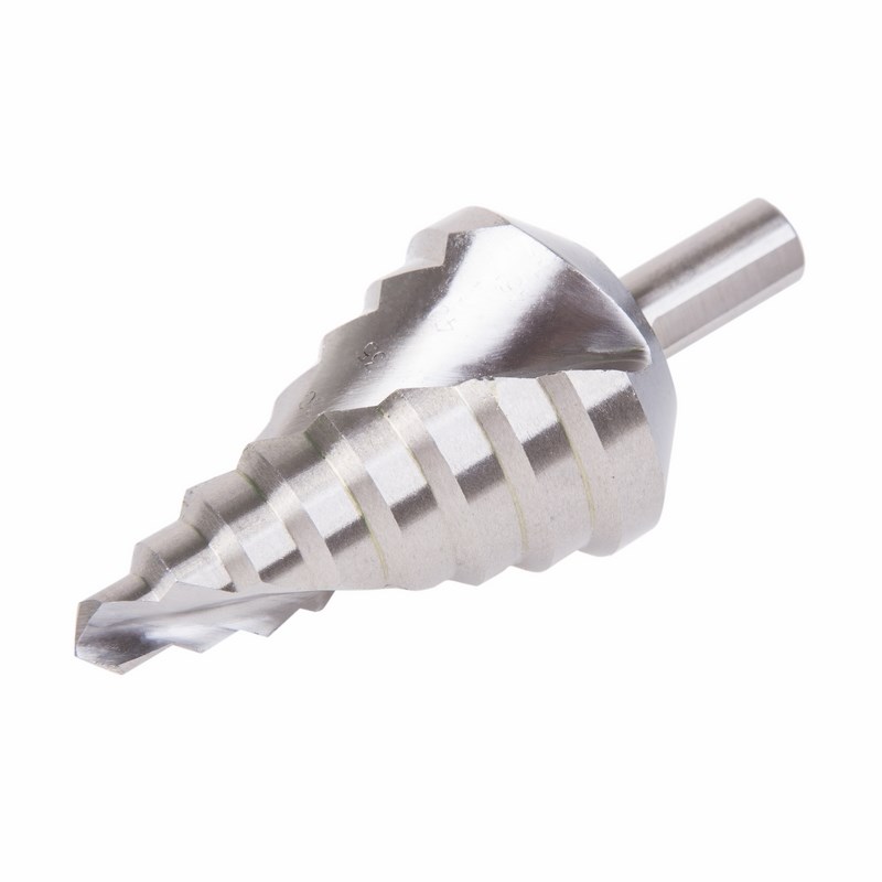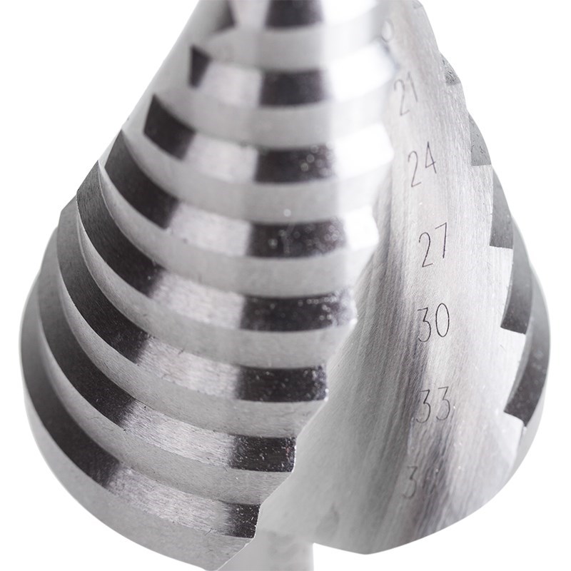 Ступенчатое сверло предназначено для получения отверстий различного диаметра без перестановки режущего инструмента. Применяется в работе с такими материалами, как пластик, дерево, металл и др. Хвостовик прибора имеет форму конуса. На каждой ступени есть маркировка фактического диаметра. Сверло изготовлено из инструментальной легированной стали и покрыто нитридом титана.