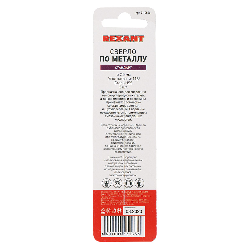 Сверло по металлу 2,5 мм HSS (2 шт. в упаковке) DIN 338 REXANT |