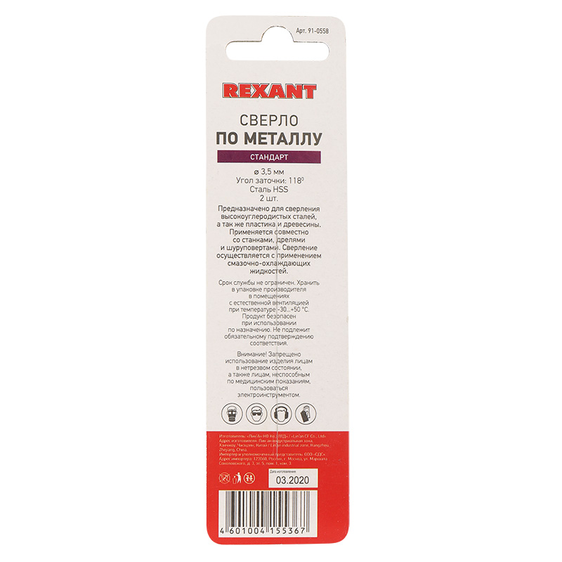 Сверло по металлу 3,5 мм HSS (2 шт. в упаковке) DIN 338 REXANT |