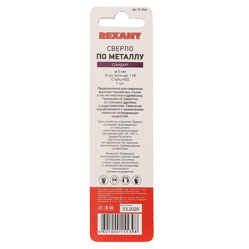 Сверло по металлу 5,0 мм HSS (1 шт. в упаковке) DIN 338 REXANT |
