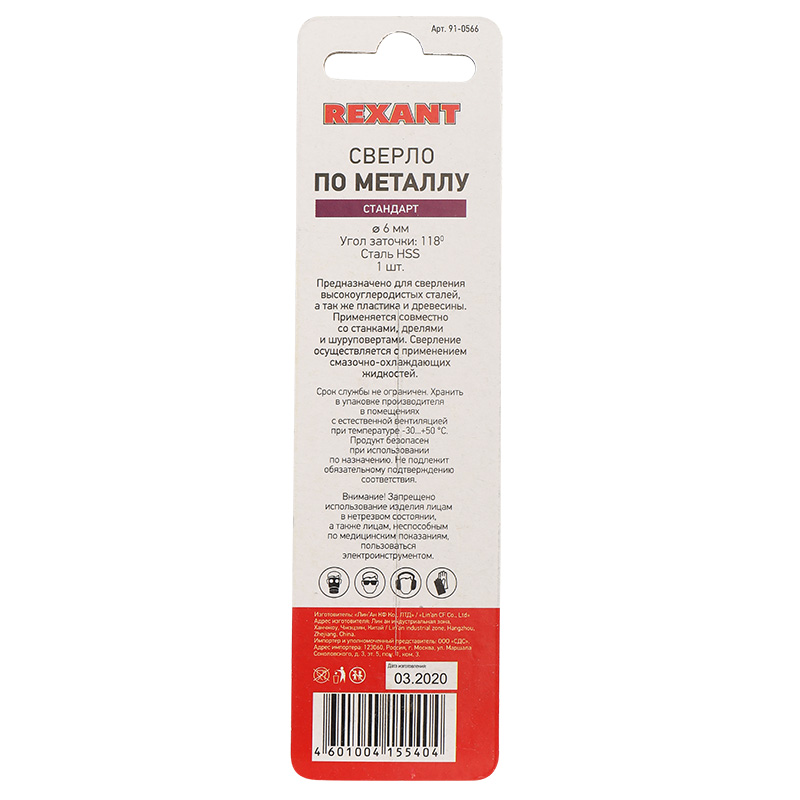 Сверло по металлу 6,0 мм HSS (1 шт. в упаковке) DIN 338 REXANT |