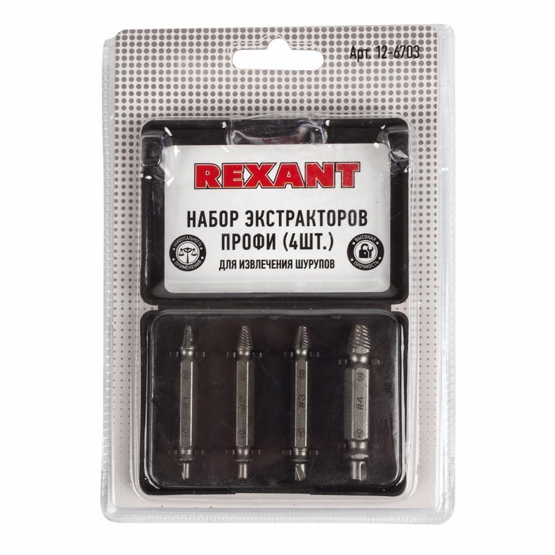 Набор экстракторов Профи REXANT предназначен для извлечения саморезов и винтов с поврежденными внутренними шлицами. Набор включает в себя четыре двухсторонние биты различных размеров.
