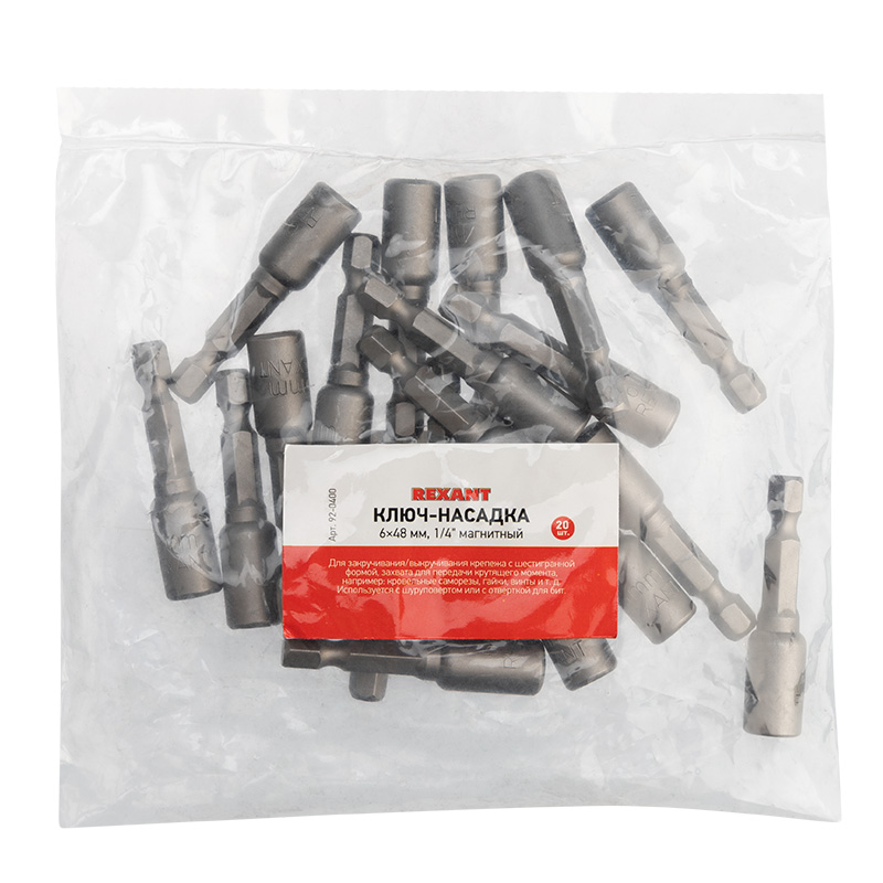 Ключ-насадка 6х48 мм, 1/4" магнитная (упак. 20 шт.) REXANT