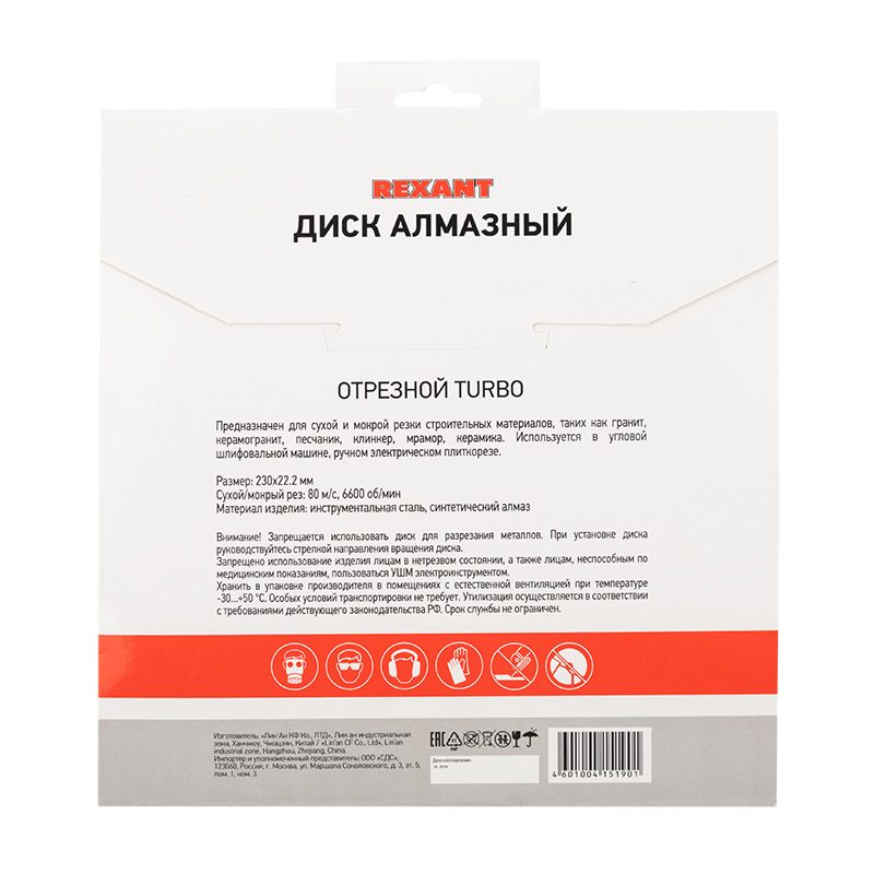 Внимание. Запрещается использовать диск для разрезания металлов. При установке диска руководствуйтесь стрелкой направления вращения диска. Используйте средства индивидуальной защиты. Не утилизировать с бытовыми отходами.