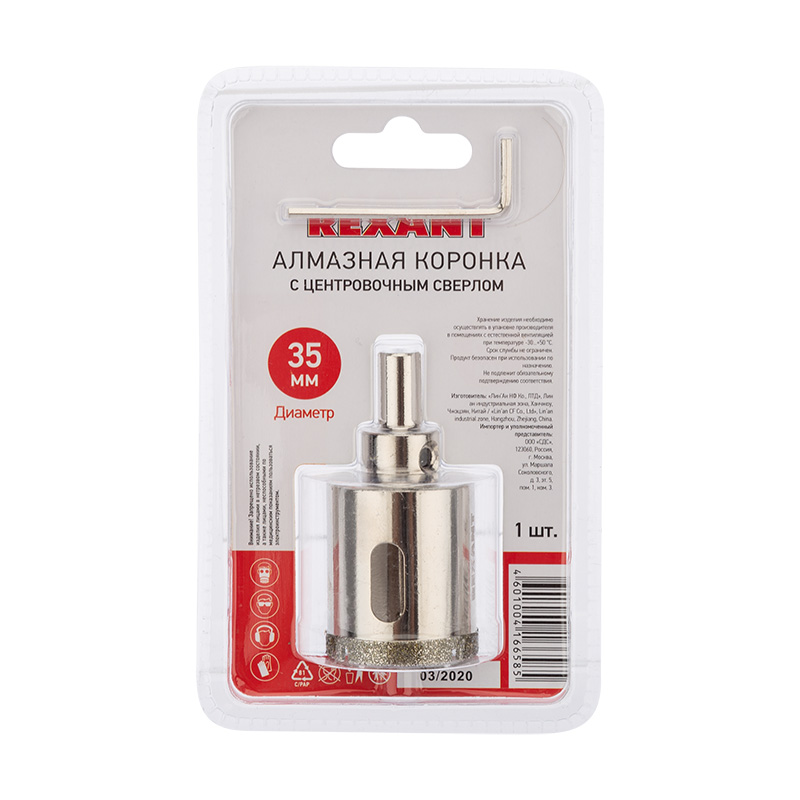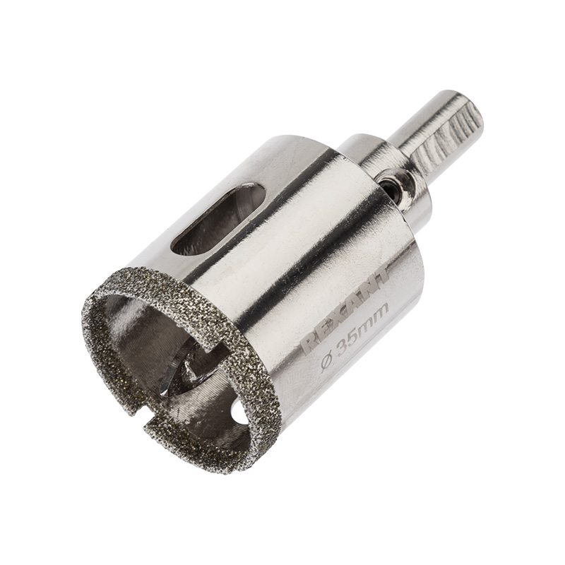 Коронка алмазная REXANT 35 мм с центровочным сверлом. Используются при сверлении керамогранита, керамики, стекла. Покрытие алмазных коронок выполнено гальваническим способом в два слоя, что обеспечивает эффективное сверление и продолжительный рабочий ресурс инструмента. При сверлении отверстий с использованием алмазных коронок все работы производятся только с охлаждением, путем подачи в рабочую зону воды.