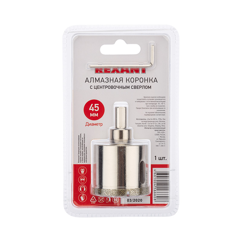 Коронка алмазная REXANT 45 мм с центровочным сверлом. Используются при сверлении керамогранита, керамики, стекла. Покрытие алмазных коронок выполнено гальваническим способом в два слоя, что обеспечивает эффективное сверление и продолжительный рабочий ресурс инструмента. При сверлении отверстий с использованием алмазных коронок все работы производятся только с охлаждением, путем подачи в рабочую зону воды.