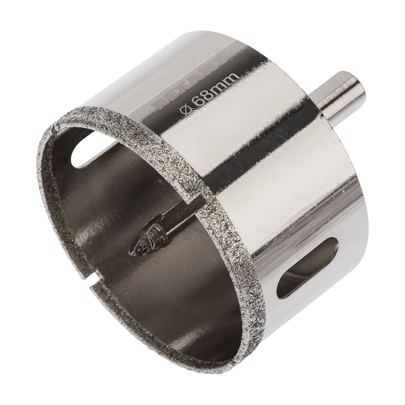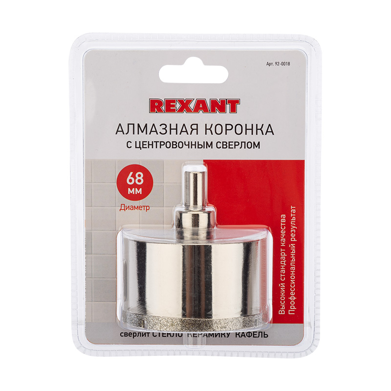Коронка алмазная REXANT 68 мм с центровочным сверлом. Используются при сверлении керамогранита, керамики, стекла. Покрытие алмазных коронок выполнено гальваническим способом в два слоя, что обеспечивает эффективное сверление и продолжительный рабочий ресурс инструмента. При сверлении отверстий с использованием алмазных коронок все работы производятся только с охлаждением, путем подачи в рабочую зону воды.