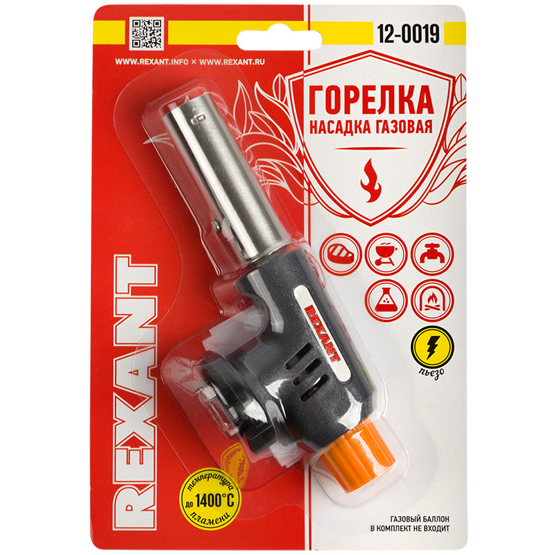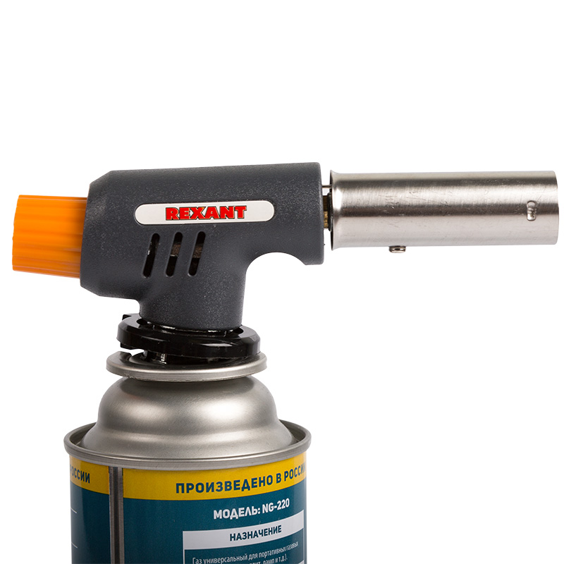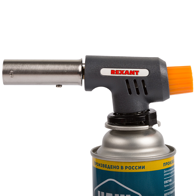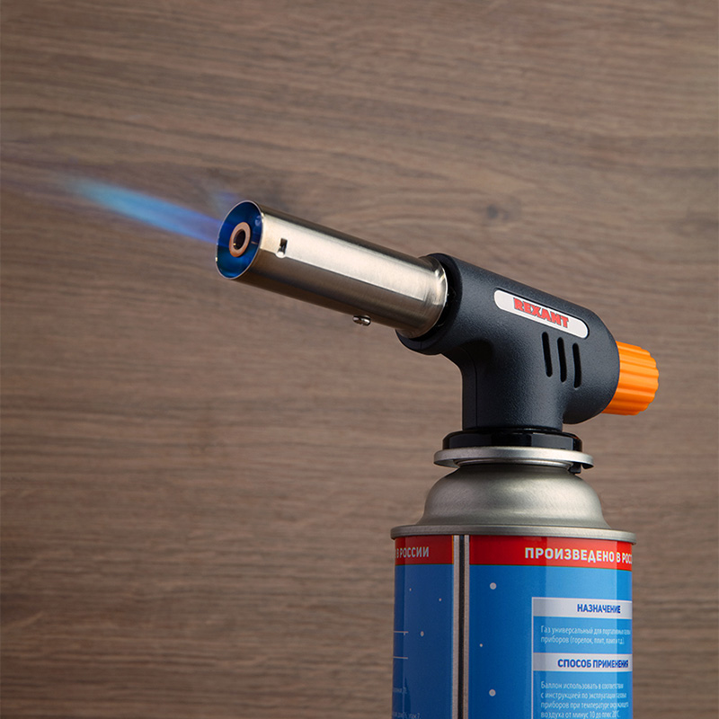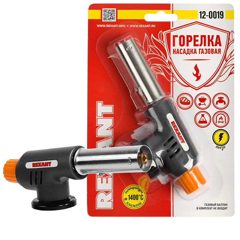 Газовая горелка-насадка REXANT GT-19 с пьезоподжигом. Благодаря наличию пьезоподжига, такой горелкой удобно пользоваться одной рукой. Отличается от других горелок серии кнопкой пьезоподжига, объединенной с вентилем регулировки подачи газовой смеси. Для инициации пьезоподжига нужно нажимать на вентиль. Рекомендуется для работы с термоусаживаемыми трубками, перчатками, муфтами; для плавления и сварки изделий из пластиков и стекла; удаления краски; обработки поверхностей на производстве и в лабораторных условиях; для разморозки замков, водопроводных труб, продуктов; для копчения продуктов или карамелизации десертов; для украшения процесса подачи блюд; для работ в саду и огороде, для быстрого и экологичного поджига дров, угля.