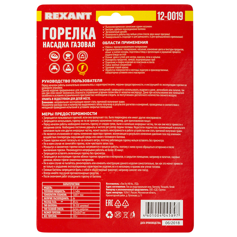 Перед началом работы с газовой горелкой REXANT необходимо ознакомиться с мерами предосторожности и инструкцией по эксплуатации на упаковке горелки!