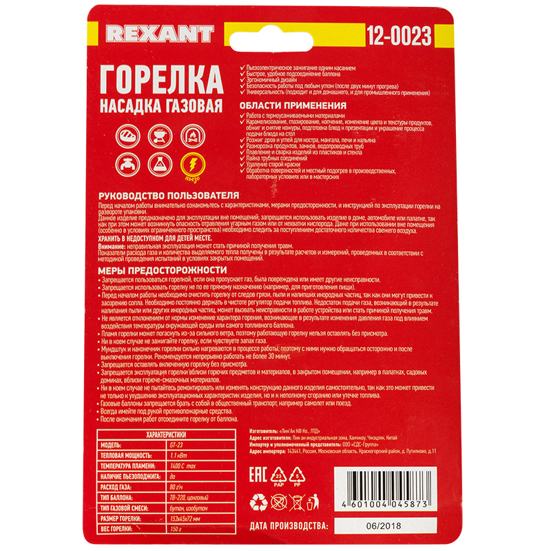 Перед началом работы с газовой горелкой REXANT необходимо ознакомиться с мерами предосторожности и инструкцией по эксплуатации на упаковке горелки!