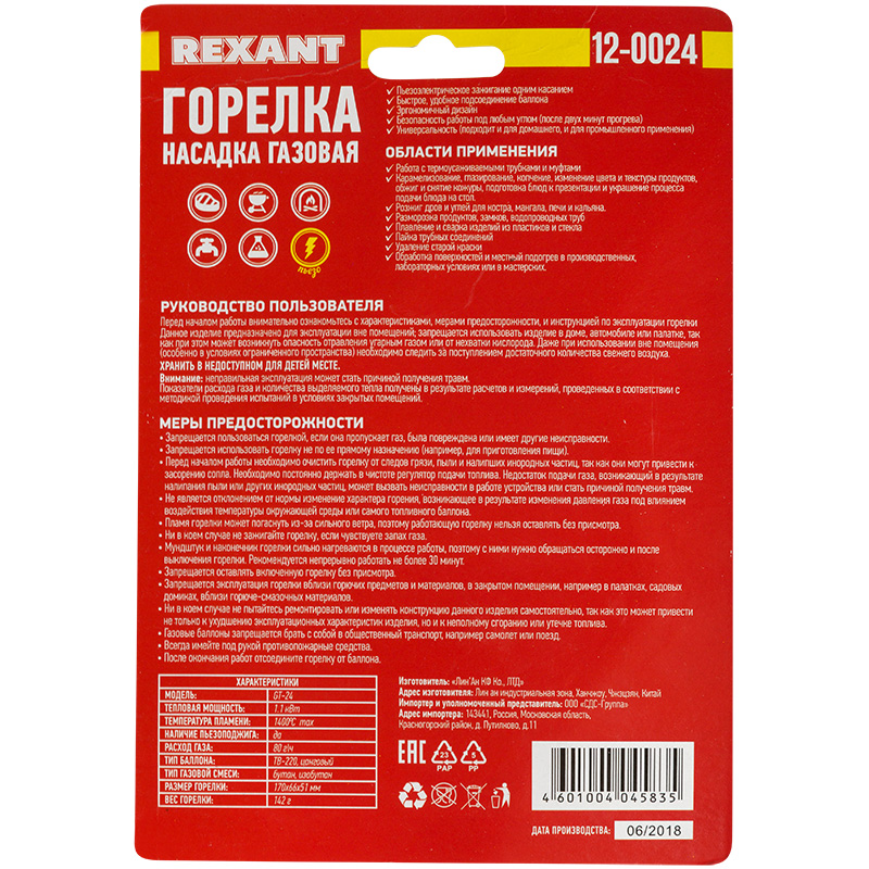 Перед началом работы с газовой горелкой REXANT необходимо ознакомиться с мерами предосторожности и инструкцией по эксплуатации на упаковке горелки!