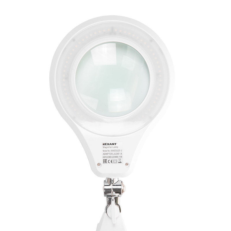 Лупа на струбцине круглая настольная 5Х с подсветкой 60 LED, белая REXANT предназначена для визуального увеличения различных мелких предметов или их фрагментов.