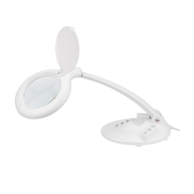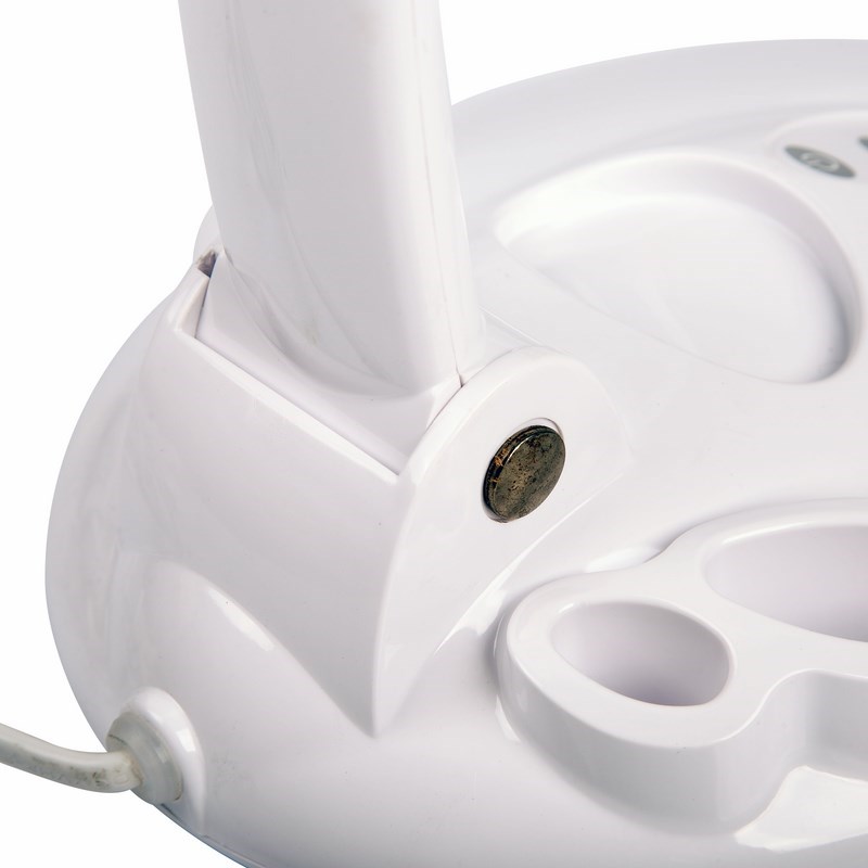 Лупа также имеет регулятор яркости подсветки (диммер), который управляется с помощью кнопок на корпусе. На подставке-основании есть специальные отделения для хранения канцелярских принадлежностей.