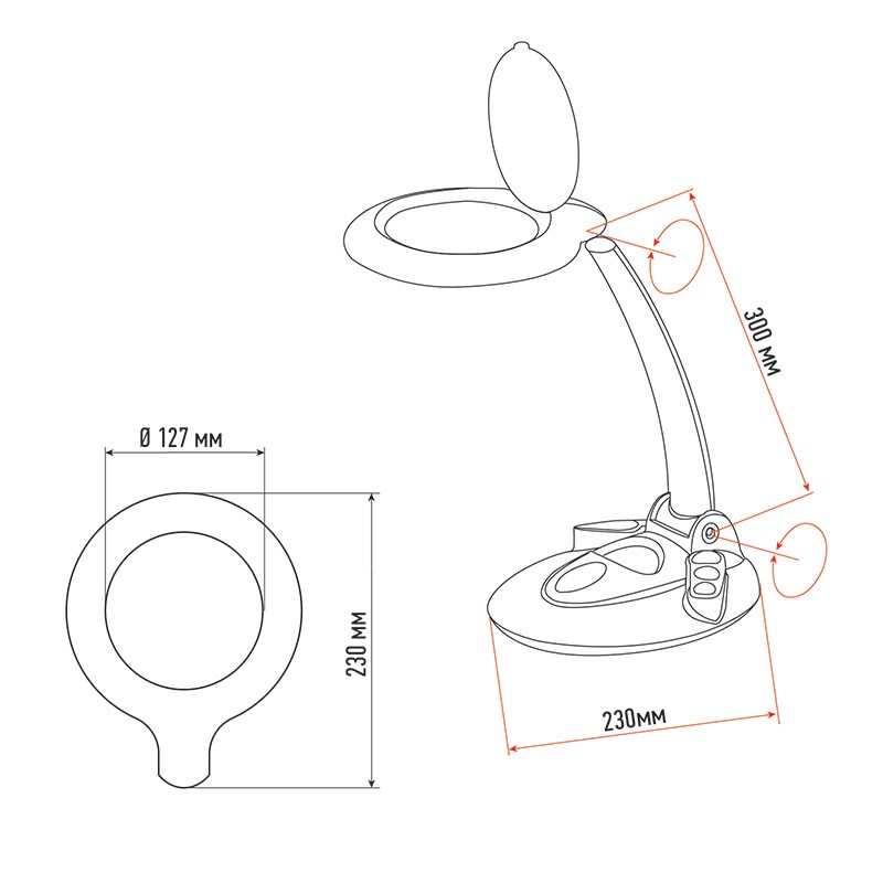Данная модель состоит из линзы, стойки-держателя, настольной подставки и подсветки LED.