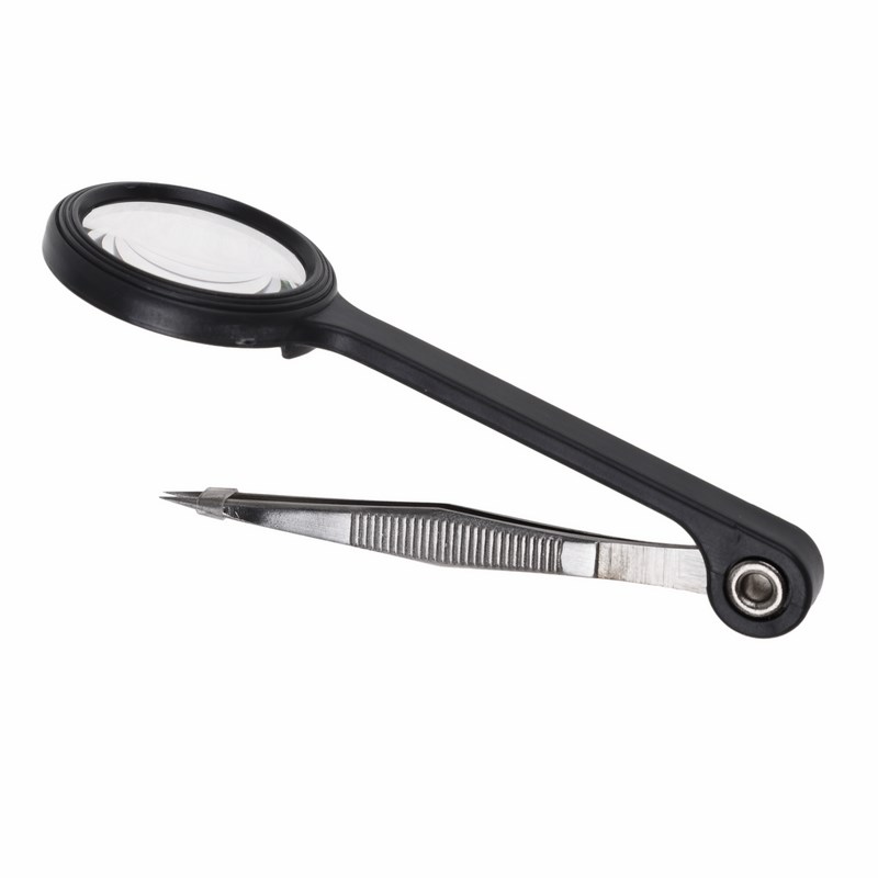 Лупа металлическая с пинцетом — удобная лупа со встроенным в рукоятку пинцетом. Такая конструкция очень полезна когда вы работаете с мелкими предметами, которые нежелательно трогать руками, например, с коллекционными монетами.