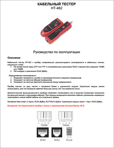 Прибор НТ-462 предназначен для тестирования линий связи построенных на основе витопарных кабелей, а также патч-кордов.
