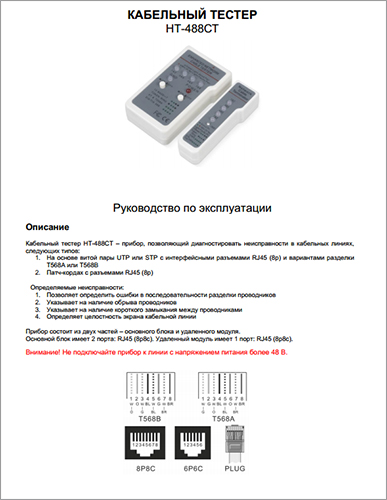 Тестер HT-488CT позволяет выявлять дефекты линий: перепутанные проводники, обрыв, замыкание.