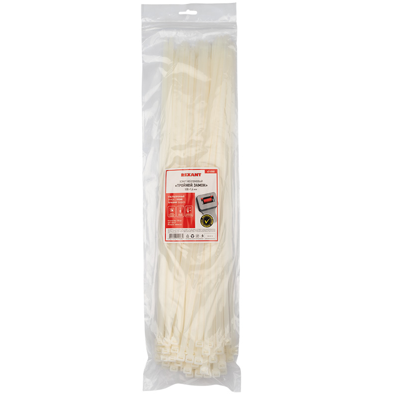 Хомут-стяжкa нейлоновая с тройным замком REXANT 500x7,6 мм, белая, упаковка 100 шт.