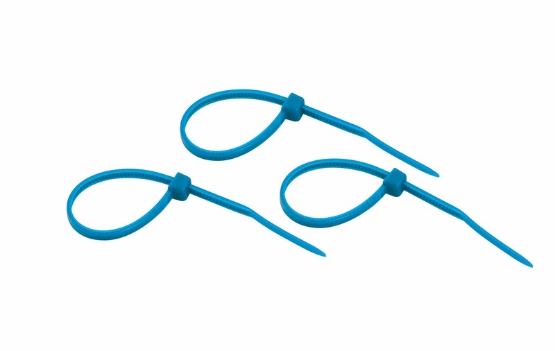 Простой и удобный монтаж осуществляется вручную следующим образом: большим пальцем левой руки прижать замок к пучку, а правой рукой затягивайте петлю, либо с помощью специального инструмента REXANT арт.12-4521 или 12-4541 (вставить конец затяжки в замок и затянуть до полной фиксации пучка, после чего отрезать выступающую часть бандажа).