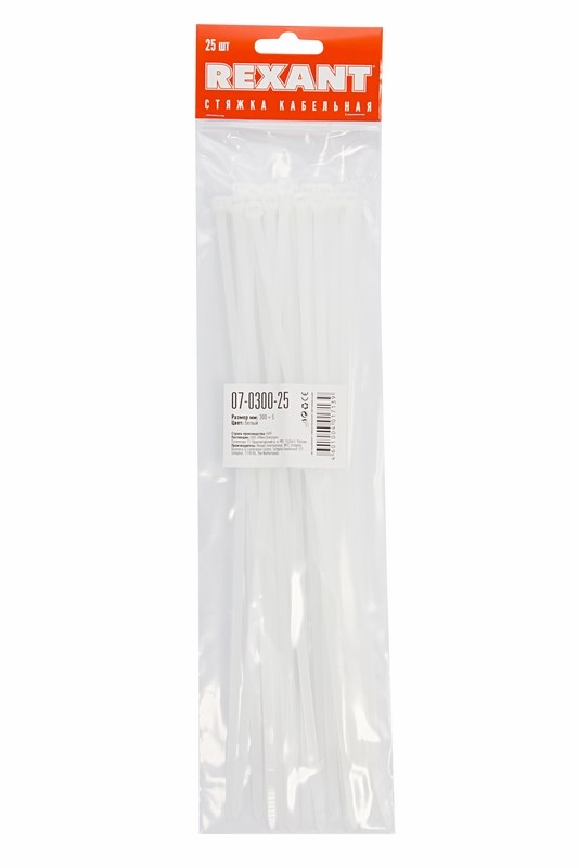 Хомут-стяжкa нeйлонoвая REXANT 300x4,8 мм, белая, упаковка 25 шт. |