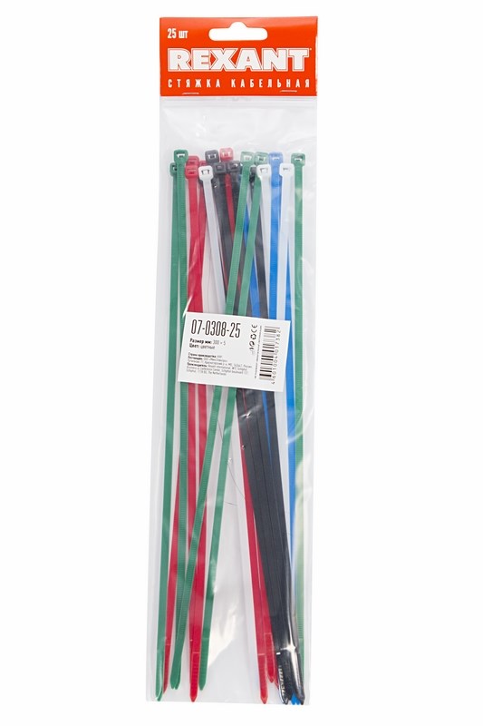 Хомут-стяжкa нeйлонoвая REXANT 300x4,8 мм, цветная, упаковка 25 шт.