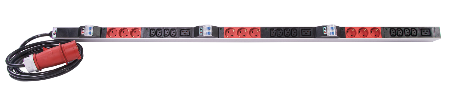Верт блок розеток Rem-3x32, 3 фазы 32A, 6 авт, инд, 9 S, 12 C13, 3 C19, 1420 мм, вх IEC 309, шнур 3м